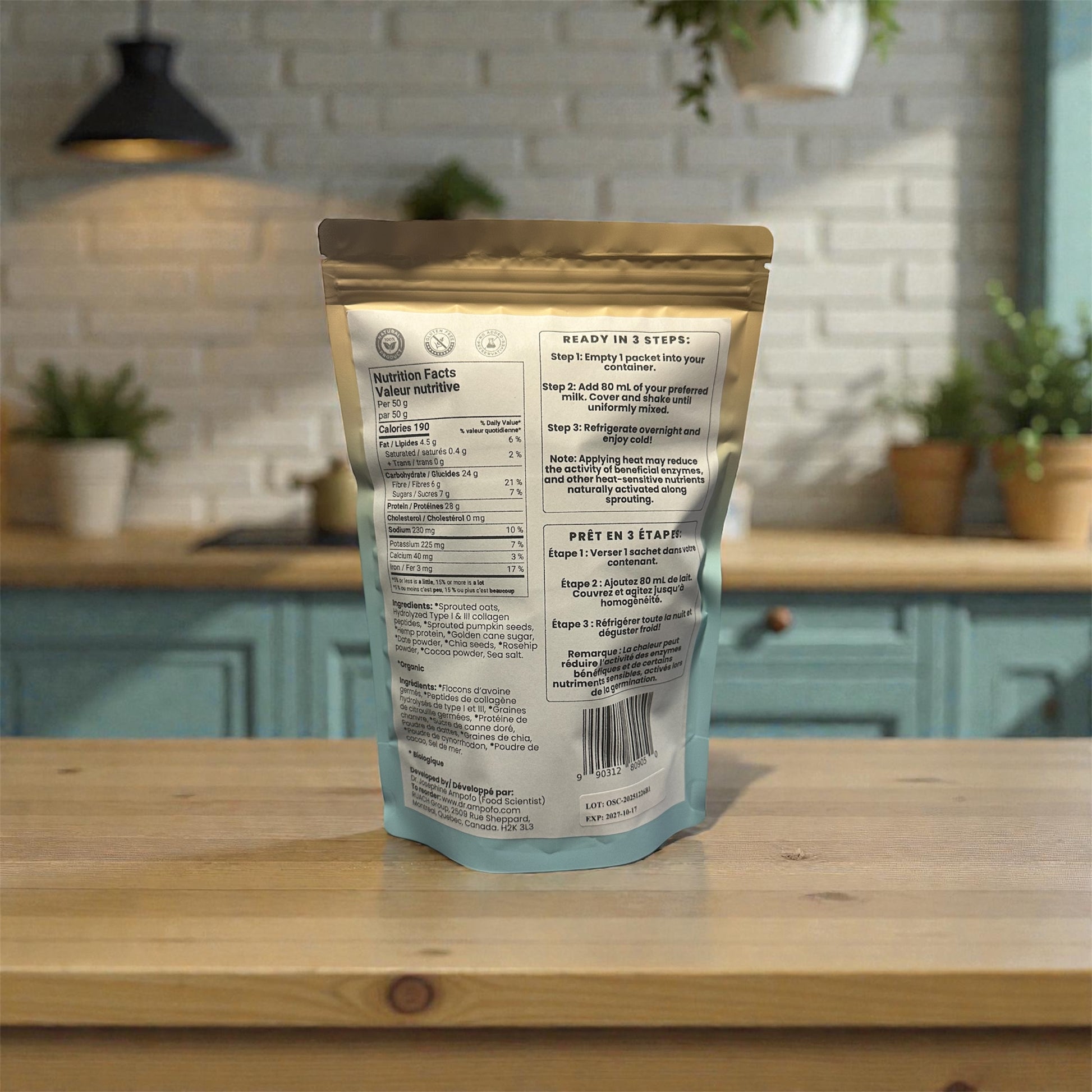 *Sprouted oats, Hydrolyzed Type I & III collagen peptides, *Sprouted pumpkin seeds, *Hemp protein, *Golden cane sugar, *Date powder, *Chia seeds, *Rosehip powder, *Cocoa powder, Sea salt.